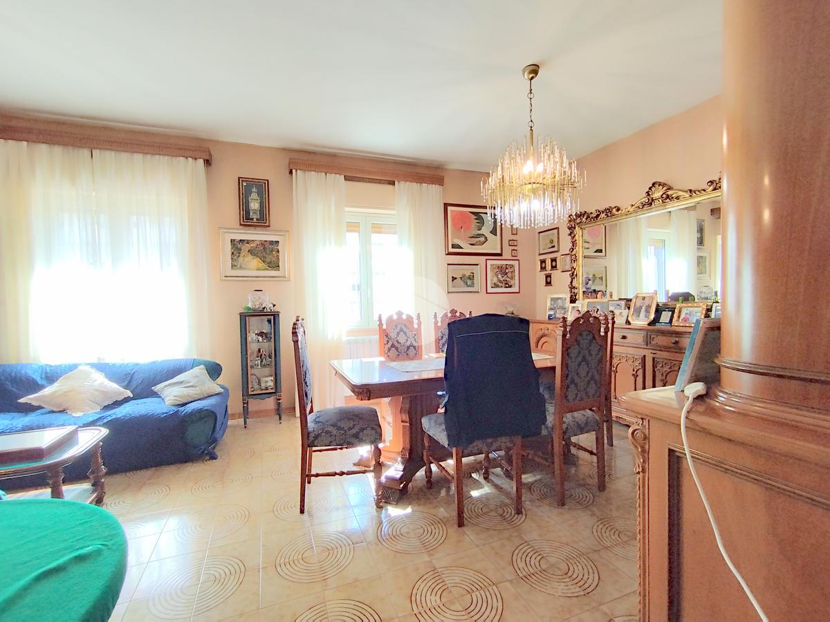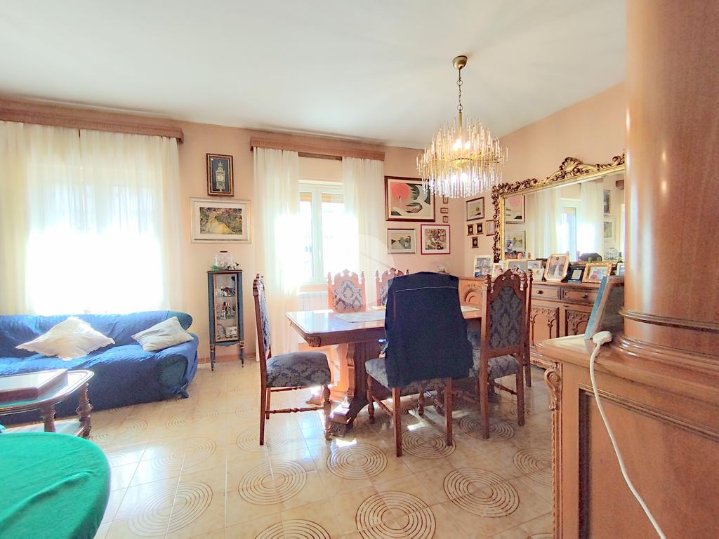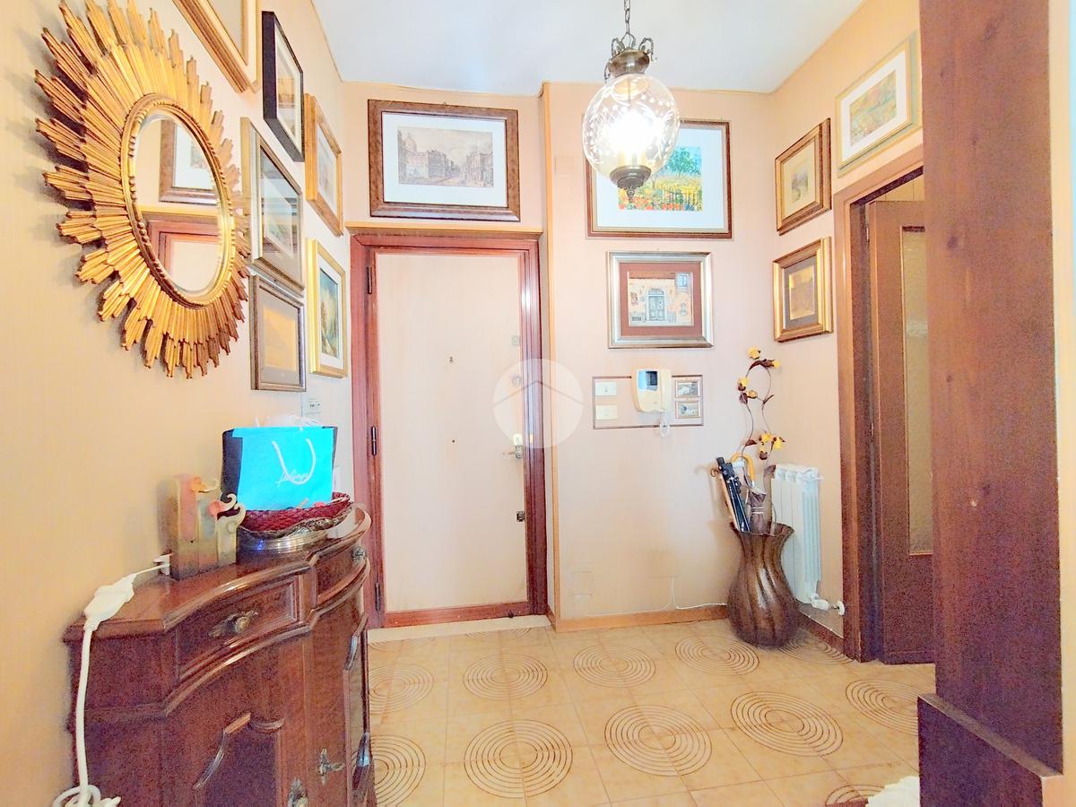L'appartamento offre una disposizione funzionale con cinque locali, tra cui tre camere da letto, doppi servizi entrambi finestrati e un doppio salone con affaccio sul prospetto principale.