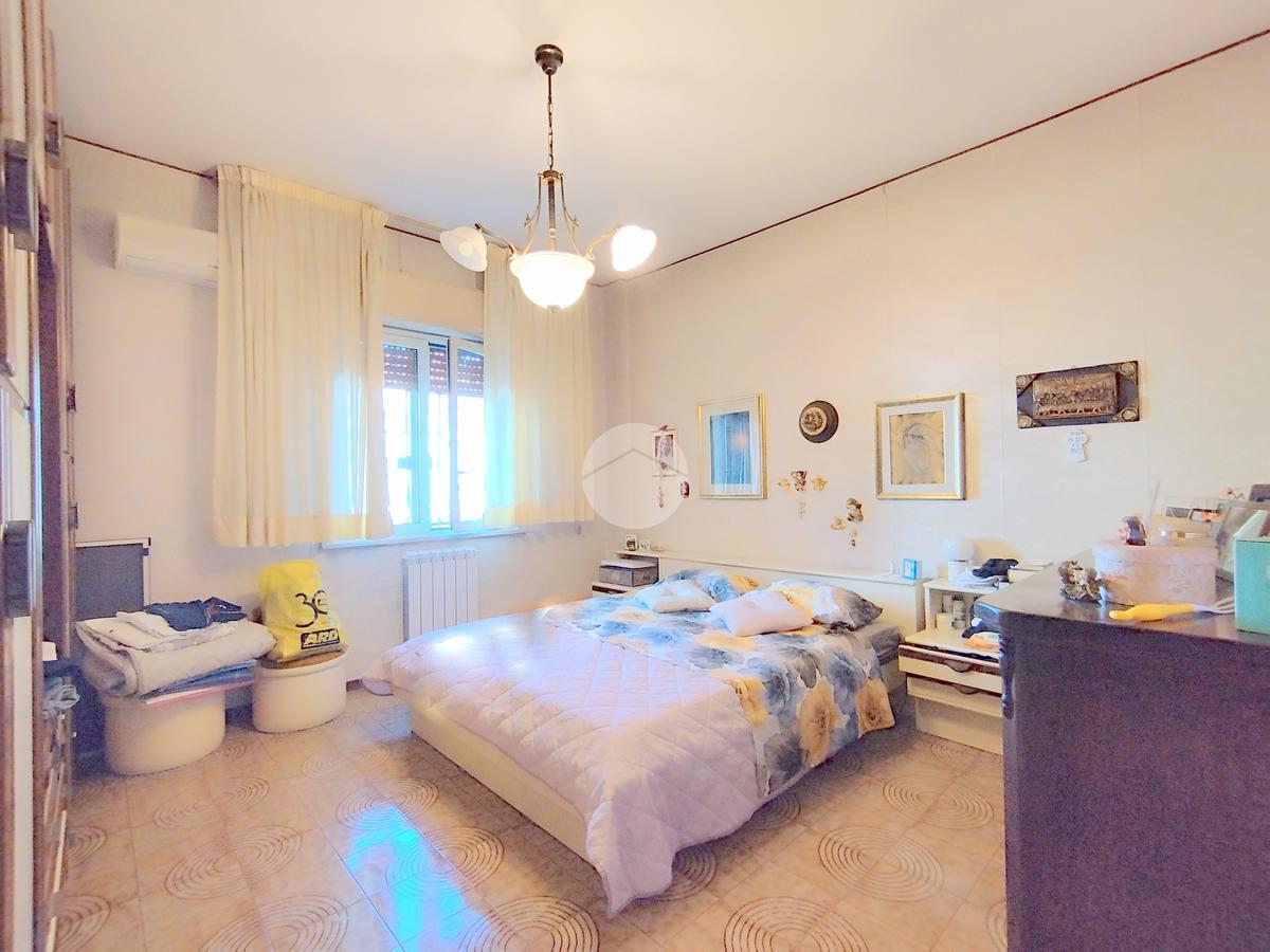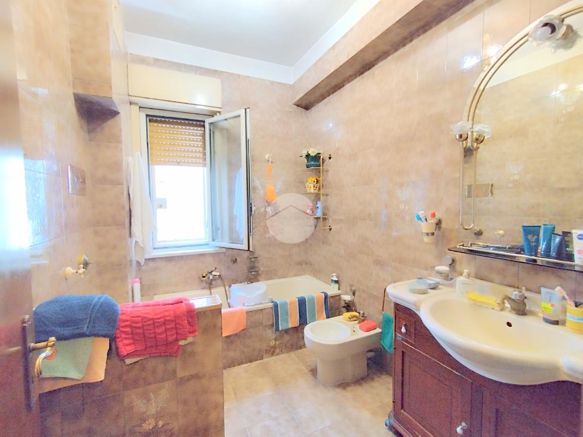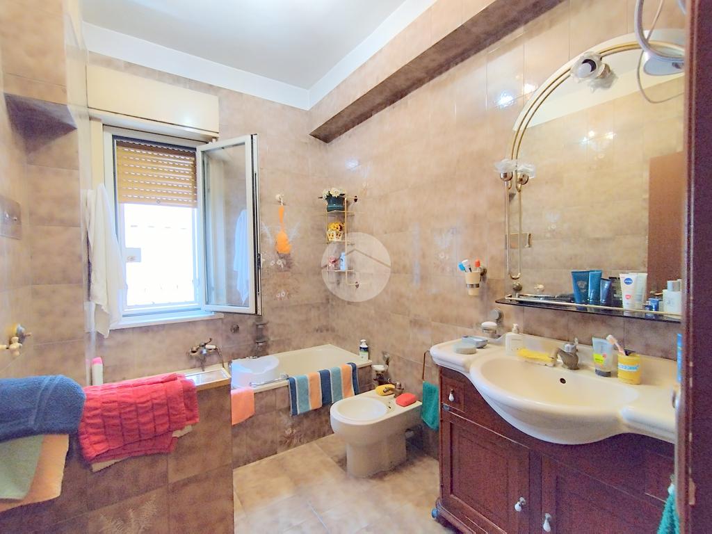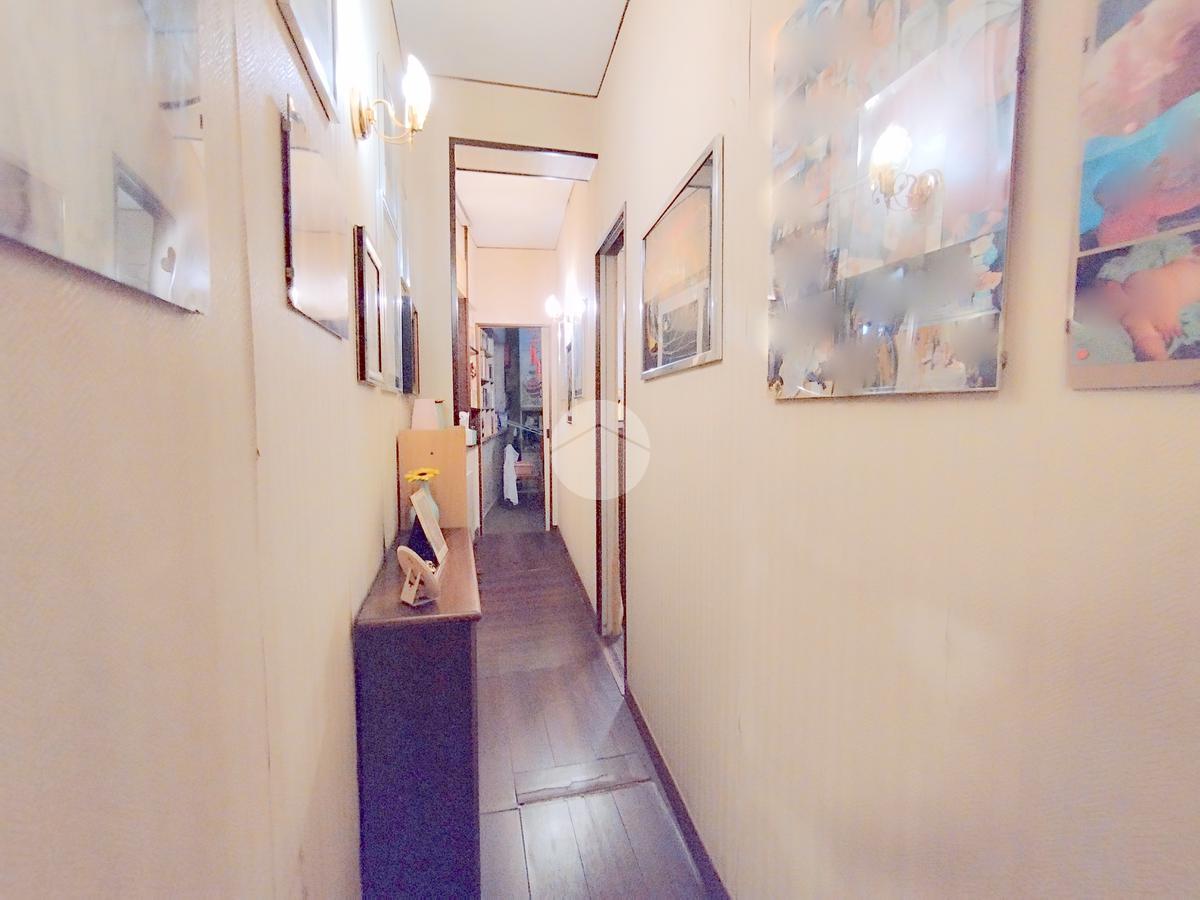 L'appartamento offre una disposizione funzionale con cinque locali, tra cui tre camere da letto, doppi servizi entrambi finestrati e un doppio salone con affaccio sul prospetto principale.